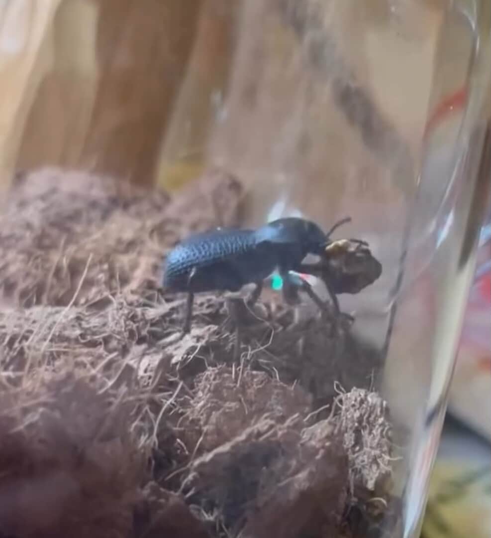 this is Noumena! she's the larger of the two blue death feigning beetles, and tends to spend more time lying around, burrowing, or eating. i named her after Kantian philosophy and Nick Land's "Fanged Noumena."