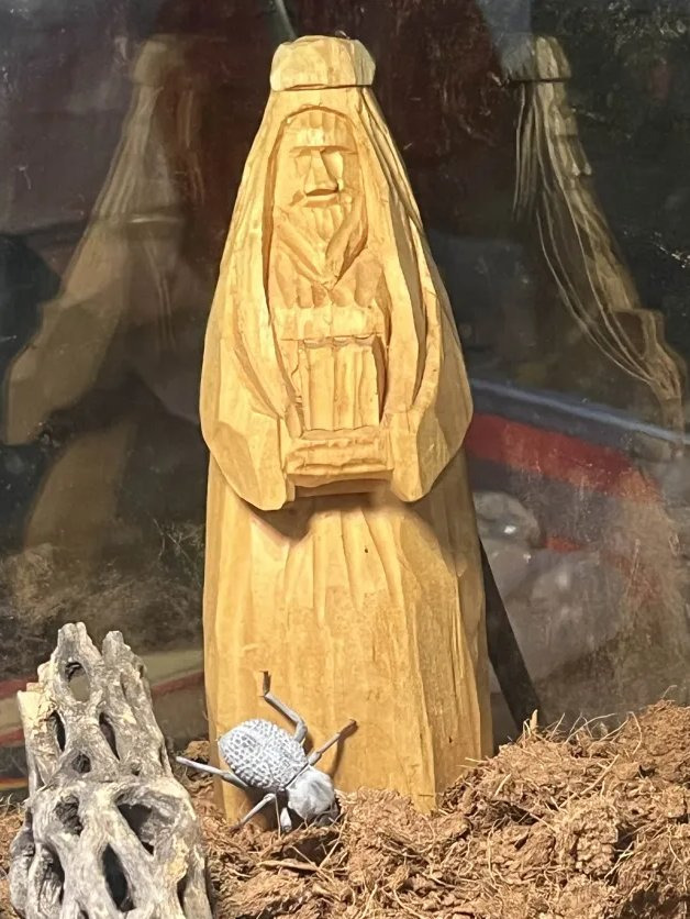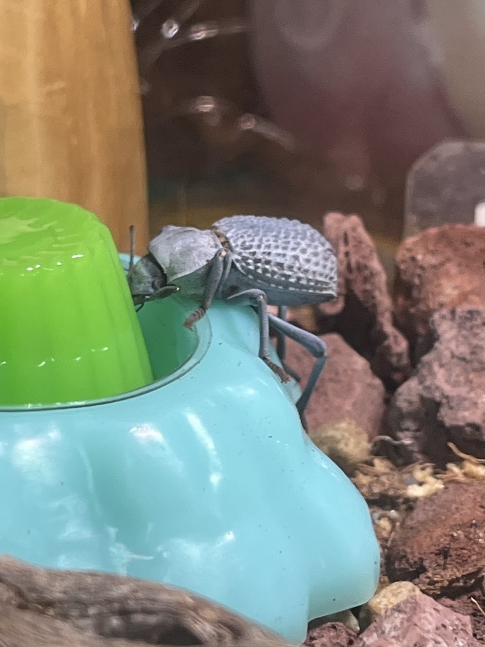 Crowley is a rough death feigning beetle, so rather than being blue, he is black with spots along his back. i chose to name Crowley after the founder of Thelema, Aleister Crowley, because he's a sneaky hyper little guy who spends most of the day scrambling around the enclosure, crawling over everything, pushing the other beetles, and hauling all the food across the tank.